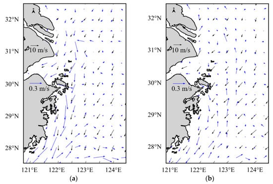 Distribution of ocean surface wind and surface current. Black and blue arrows indicate the direction of wind and current, respectively (direction they were flowing to). (a) Wind: 6 April 2021 02:00 UTC. Current: 6 April 2021 02:30 UTC. (b) Wind: 7 April 2021 10:00 UTC. Current: 7 April 2021 09:30 UTC.