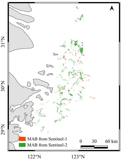 Additionally, the outcomes of the MAB detection from the Sentinel−1 and Sentinel−2 images from a different time period (19 and 20 April 2021) are depicted in Figure 10. The MAB coverage area was found to be approximately 6.8 km2 and 21.97 km2 for Sentinel−1 and Sentinel−2, respectively. The MAB dispersion region was the same as the prior period (Figure 10).