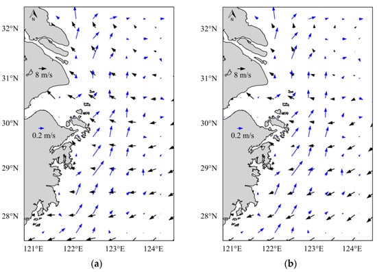 Distribution of ocean surface wind and current. Black and blue arrows indicate the direction of wind and current, respectively. (a) Wind: 19 April 2021 10:00 UTC. Current: 19 April 2021 09:30 UTC. (b) Wind: 20 April 2021 03:00 UTC. Current: 20 April 2021 02.30 UTC.