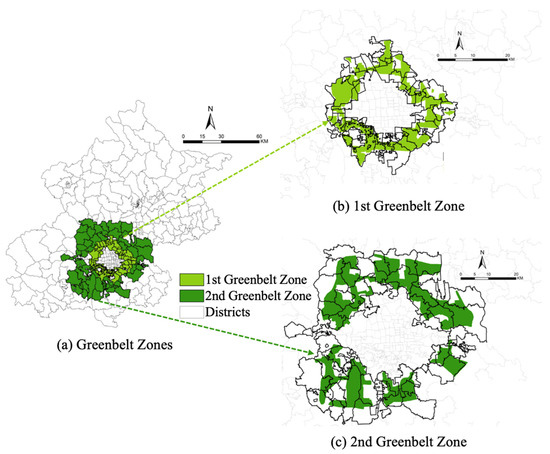 (a) Maps of districts in Beijing with highlighted districts covering the 1st Greenbelt Zone in dark green and the 2nd Greenbelt Zone in light green; (b) The spatial distribution of the 1st Greenbelt Zone; (c) The spatial distribution of the 2nd Greenbelt Zone.
