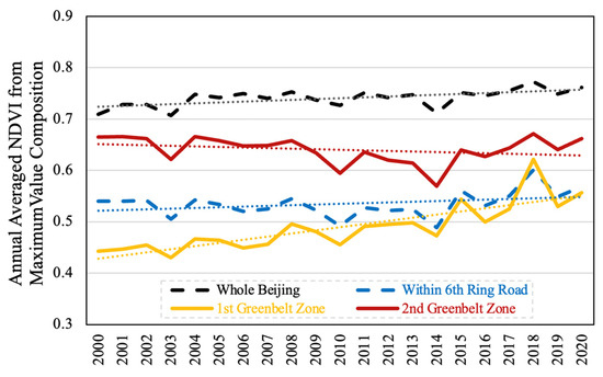 Trends in NDVI changes in Beijing from 2000 to 2020. The NDVI data are annual mean MODIS NDVI observations derived using maximum value composition method. The NDVI time series for the whole Beijing, the region within the 6th Ring Road, the 1st Greenbelt Zone, and the 2nd Greenbelt Zone are shown.