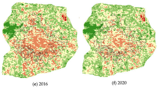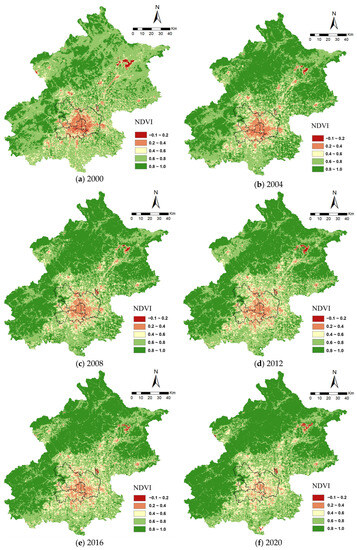 The NDVI raster maps for the six representative years of 2000, 2004, 2008, 2012, 2016, and 2020 for the entire area of Beijing are shown in Figure 3. Based on the range of NDVI values, the vegetation growth condition in the study area is categorized into five levels from low to high NDVI value ranges (Table 3). Different colors were used in the spatial map to represent different classes, with Class I (in deep red), Class II (in orange), Class III (in yellow), Class IV (in light green), and Class V (in green) representing NDVI ranges of −0.1 to 0.2, 0.2 to 0.4, 0.4 to 0.6, 0.6 to 0.8, and 0.8 to 1, respectively. Higher NDVI values indicate better vegetation density and quality, while lower NDVI means the opposite. From a spatial distribution perspective, NDVI shows a circular trend of gradual increase from the center to the outskirts. The areas with NDVI values higher than 0.8 are mainly distributed in the mountainous regions in the northeast, northwest, and southwest of Beijing. In contrast, the plain areas in the east have lower NDVI values compared with the surrounding mountainous regions. The central urban area exhibits the lowest NDVI values.