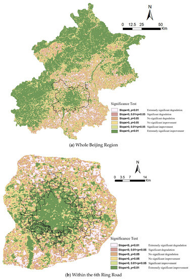 Furthermore, we carried out a significance test to quantify the significance level of the NDVI trend, as shown in Figure 5. The results are shown in Figure 6a for the whole Beijing region and (b) for the region within the 6th Ring Road. The proportional area of different significance level for the NDVI trends is given in Table 6. Overall, we can see within the 6th Ring Road that the areas showing moderate to severe degradation and moderate to severe improvement have significant trends in general. However, outside the 6th Ring Road, while the mountainous regions show significant improvement, the NDVI trend for most of the plain regions may not be significant.