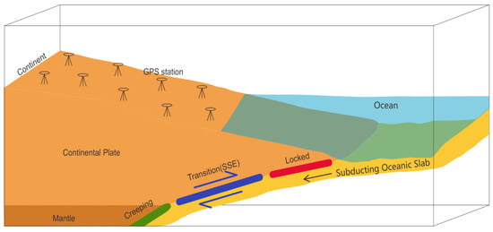 Slow slip events (SSEs) are geophysical phenomena occurring at the transitional sections of tectonic plates where accumulated stress from plate motion is relieved through slow slippage [1]. Owing to their slow movement and prolonged duration (ranging from several days to years), and the absence of seismic radiation [2], SSEs are challenging to detect via seismometers. Because of the advantages of the all-weather, high-precision, dense distribution, and the ability to be used over wide ranges, the use of the Global Positioning System (GPS) has become the primary detection tool for the SSEs (as shown in Figure 1). Therefore, it is currently extensively employed across the Pacific Ring of Fire subduction zones [3,4], notably in Cascadia [5], Japan [6,7], Mexico [1], Costa Rica [8], and New Zealand [9,10,11].