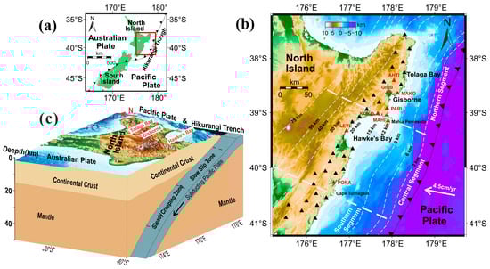 The study area is illustrated in Figure 2. The Pacific Plate subducts westwards beneath the Australian Plate along the Hikurangi Trench at a velocity of approximately 4.5 cm/year, forming the Hikurangi Subduction Zone beneath the North and northeastern South Island [23,24]. Segmented along its strike, the subduction zone can be divided into three parts: the northern section, located north of Mahia; the central section, situated between Mahia and Cape Turnagain; and the southern section, extending from Cape Turnagain to the Chatham Rise, where the subduction terminates at the northeastern South Island. Shallow SSEs (2–20 km deep) frequently occur along the northern and central sections of the subduction margin, primarily distributed in the Tolaga Bay, Gisborne, and Hawke’s Bay regions on the eastern coast of the North Island. In contrast, deeper SSEs (30–60 km deep) regularly take place in the southern regions of Manawatu and Kapiti [25,26].