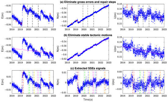 The procedure of extracting SSEs signals from GPS coordinate time series in the Hikurangi Subduction Zone. In subfigure (a), the dark dashed vertical lines represent the steps (The steps master file can be found at http://geodesy.unr.edu/NGLStationPages/steps.txt (accessed on 12 September 2023)). The red error bars indicate outliers and their uncertainties exceeding five times the mean error, which are discarded as outliers. The blue dots represent the GPS coordinate time series after step restoration and outlier removal. In subfigure (b), the red diagonal line illustrates the constant and velocity terms in the GPS coordinate time series model, with the blue dots showing the coordinate time series after removing these two terms. In subfigure (c), the blue dots represent the time series of slow slip displacements, and eight different colors of dashed lines are used to mark the eight SSEs.