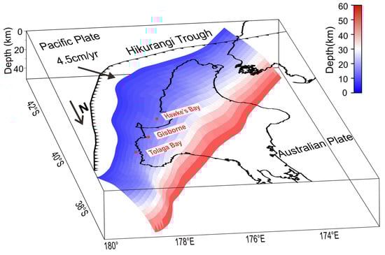 - Williams, C.A.; Eberhart-Phillips, D.; Bannister, S.; Barker, D.H.N.; Henrys, S.; Reyners, M.; Sutherland, R. Revised Interface Geometry for the Hikurangi Subduction Zone, New Zealand. Seismol. Res. Lett. 2013, 84, 1066–1073. [Google Scholar] [CrossRef]