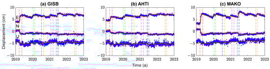 Surface displacements of SSEs using the NIF method using GISB, AHTI, and MAKO stations as an example (the blue dots represent the extracted time series of slow slip displacements from GPS, the solid red line represents the displacement time series obtained from the inversion using the NIF method. Eight different colors of dashed lines are used to mark the eight SSEs).