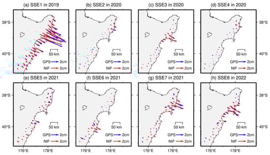 Table 1 summarizes the statistics of the investigated eight SSEs, including the main slip region, start and end time, maximum surface displacement, cumulative slip, and maximum daily slip rate. The identified SSEs from 2019 to 2021 are generally consistent with the results obtained by Ducellier et al. [36] using wavelet analysis. From 2019 to 2022, these SSEs primarily occurred in the Tolaga Bay, Gisborne, and Hawke’s Bay regions, with a duration ranging from 22 days to 58 days. During the SSEs, the maximum surface displacements ranged from 0.62 to 4.13 cm, the cumulative slips ranged from 2.39 to 14.35 cm, and the daily slip rates ranged from 1.83 to 8.69 mm/day.