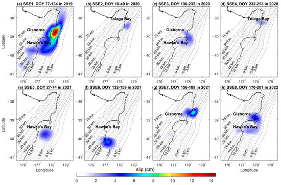Figure 7 shows the cumulative slip of the faults during the eight SSEs from 2019 to 2022. Among the eight shallow SSEs, SSE2, and SSE4 were observed near Tolaga Bay; SSE1, SSE3, and SSE8 were distributed in Gisborne-Hawke’s Bay; SSE7 occurred in Gisborne; SSE5 and SSE6 were identified near Hawke’s Bay and its southern region. In terms of slip magnitudes, SSE1, occurring in 2019, exhibited the largest cumulative slip of 14.35 cm (Figure 7a), which is consistent with the results obtained by Woods et al. [25]. SSE4, occurring in 2020, had the smallest cumulative slip of 2.39 cm (Figure 7d). The most recent SSE, which took place in 2022, had a cumulative slip of 4.87 cm (Figure 7h). Furthermore, the cumulative slip uncertainties of the eight SSEs do not exceed 3 mm (Figure S1). Concerning slip depths, all eight SSEs occurred within the depth range of 6–20 km.