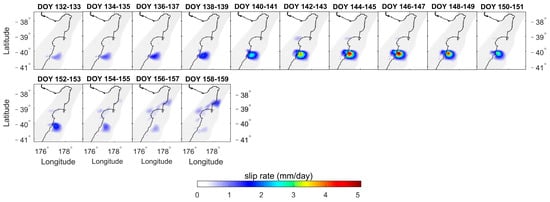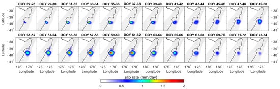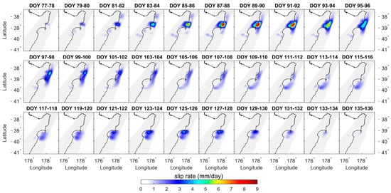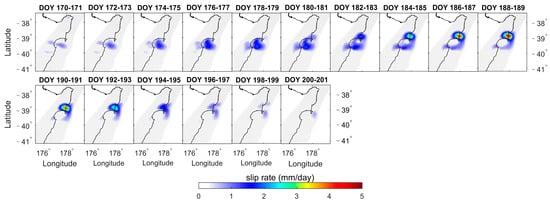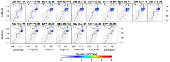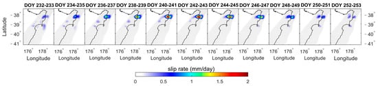 Figure 8, Figure 9, Figure 10, Figure 11, Figure 12, Figure 13, Figure 14 and Figure 15 depict the daily slip rates of the eight SSEs (averaged over two-day intervals). SSE1, SSE2, SSE3, SSE5, and SSE8 exhibit significant bi-phasic behavior characterized by acceleration-deceleration-acceleration-deceleration patterns. In Figure 8, SSE1 accelerates first, reaching a peak slip rate of 8.69 mm/day (2019, DOY 89–90, Gisborne), and next accelerates for a peak of 3.94 mm/day (2019, DOY 125–126, Hawke’s Bay). The two acceleration periods occurred in different geographical regions with some temporal overlap. In Figure 9, SSE2 accelerated first, reaching a peak slip rate of 0.97 mm/day (2020, DOY 18–27, Tolaga Bay), and next accelerated for a peak of 2.30 mm/day (2020, DOY 32–41, Tolaga Bay). Similarly, in Figure 10, SSE3 firstly accelerated, reaching a peak slip rate of 1.98 mm/day (2020, DOY 202–203, Hawke’s Bay), and next, accelerated for a peak of 2.44 mm/day (2020, DOY 222–223, Gisborne). In Figure 12, SSE5 accelerated first, reaching a peak slip rate of 1.55 mm/day (2021, DOY 27–44, Hawke’s Bay), and next accelerated for a peak of 1.89 mm/day (2021, DOY 45–72, Hawke’s Bay). Figure 15 displays SSE8, which accelerated first, reaching a peak slip rate of 1.86 mm/day (2022, DOY 170–181, Hawke’s Bay), and next accelerated for a peak of 4.54 mm/day (2022, DOY 188–189, Gisborne). SSE4 (Figure 11), SSE6 (Figure 13), and SSE7 (Figure 14) exhibited only one acceleration-deceleration phase, with peak slip rates of 1.83 mm/day (2020, DOY 242–243, Tolaga Bay), 5.05 mm/day (2021, DOY 146–147, Hawke’s Bay), and 4.61 mm/day (2021, DOY 168~169, Gisborne), respectively. The magnitudes of the daily slip rates for the eight SSEs differed, and their propagation directions varied as well. SSE1 propagated from northern (Gisborne) to southern (Hawke’s Bay). On the other hand, SSE3 and SSE8 had similar sliding regions to SSE1, propagating along the subduction zone but in the opposite direction, from Hawke’s Bay to Gisborne. SSE2, SSE4, SSE5, SSE6, and SSE7 are associated with the sliding regions of Tolaga Bay, Tolaga Bay, Hawke’s Bay, south of Hawke’s Bay, and Gisborne, respectively.