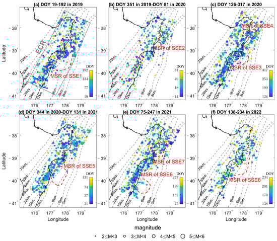 To explore the relationship between SSEs and seismic activities, a spatiotemporal statistical analysis of these events is conducted. The spatial analysis encompasses two distinct regions: firstly, a broad expanse encompassing all eight SSEs, designated as the ‘eastern coastal region (ECR) of the North Island, New Zealand’, and secondly, the ‘main slip regions (MSR)’ of each individual SSE. The latter regions are defined as areas where the cumulative slip accounts for over 90% of the total slip. The temporal analysis extends over specific time intervals, including the period during each SSE (as indicated in Table 1 as ‘Duration’), the period before each SSE (extending backward from the moment of SSE onset by the same ‘Duration’), and the period after each SSE (extending forward from the moment of SSE termination by the same ‘Duration’). Utilizing these spatial and temporal parameters, spatial analysis (as shown in Figure 16) and temporal frequency analysis (as depicted in Figure 17) are conducted by querying the New Zealand earthquake catalog (https://quakesearch.geonet.org.nz/ (accessed on 12 September 2023)).
