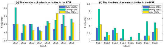 Figure 16a–f shows the spatial distribution of the seismic activities corresponding to before, during, and after the occurrences of the eight SSEs in ECR, as well as in MSR. Due to the partial temporal overlap between SSE3 and SSE4, the seismic activities related to these two SSEs are depicted in the same subplot (Figure 16c). Similarly, SSE6 and SSE7 are shown together in Figure 16d. Therefore, Figure 16 shows only six seismic analysis periods. Due to the high frequency of seismic activity occurrences, many of which are of small magnitude (below magnitude 6), the correlation between SSEs and seismic activity is not readily discernible from the spatial distribution in Figure 16. Therefore, we will conduct a temporal statistical analysis to further investigate their relationship.
