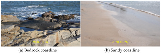 Weitou Bay is selected as our study area (Figure 1). The area is located in southeastern Quanzhou City, a famous coastal city of Fujian Province in China [38]. The study area falls under a subtropical monsoon climate, close to the Taiwan Strait, where the tidal range has a large spatial variation, with a mean tidal range of approximately 4 m [39]. In addition, the semi-diurnal tide is dominant in the Weitou Bay area [40], and the tidal state at the time of image acquisition is shown in Table 1. The coastline in this region can be categorized into two types: the natural coastline, unaffected by human development, and the artificial coastline, which is affected by human activities [41,42]. The natural coastlines in the study area include bedrock coastlines, sandy coastlines, and silty coastlines [43], while the coastlines dominated by artificial dikes are taken as artificial coastlines [44]. The coastline types are shown in Figure 2.