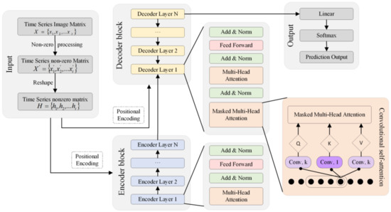 Similarly, the decoder block also includes six decoders. In contrast to each encoder layer, each decoder incorporates an additional sublayer, enabling the interactive learning of multiple self-attention operations with the output of the encoder. In addition, the multihead self-attention mechanism of the encoder employs a mask to prevent the time-series data prediction process from learning future information. Finally, the decoder output is subjected to a linear transformation layer and a softmax layer, and the prediction results are derived by processing the matrix transformation by referring to the reverse process of the input layer.