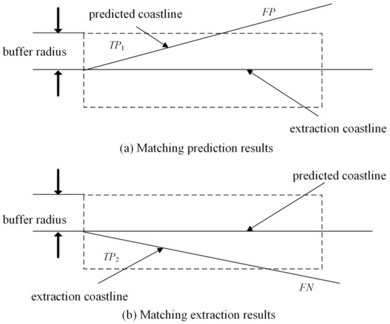 The ROC curve-matching principle, based on the spatial relationships along the coastline and not only considering the characteristics of the coastline but also matching a linear target to evaluate the accuracy of the coastline, is proposed [65]. This method first defines the accurately extracted coastline as a real coastline and then establishes a buffer zone with a buffer radius of n pixel units based on the real coastline. Thus, the real coastline and the predicted coastline are superimposed and analyzed. As shown in Figure 5, the true-positive (TP1) represents the length of the predicted coastline that was successfully matched within the established buffer, and the false-positive (FP) represents the length of the coastline that was not successfully matched. Similarly, a pixel-based buffer is built around the predicted coastline and subsequent coverage analysis is performed. In this case, TP2 represents the actual coastline length that was successfully matched in the buffer, while the false-negative (FN) represents the unmatched coastline length in the buffer.