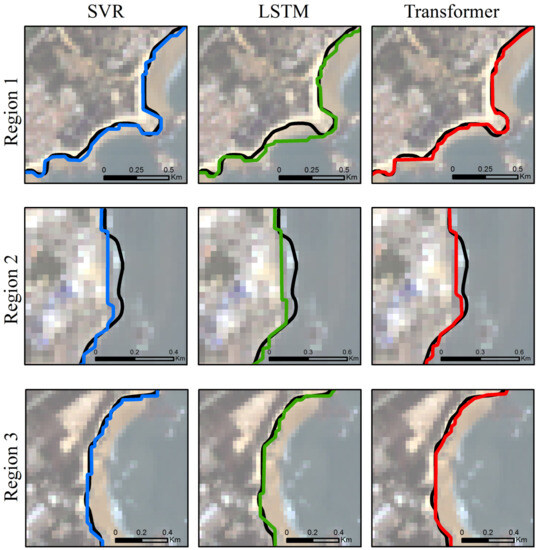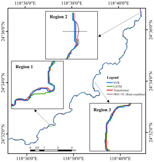 Our study has demonstrated that the predictions of the three models generally coincide with the real coastline extracted by the IWE + TC method in most areas of the Weitou Bay region, and the result of the transformer model exhibits the closest agreement with the real coastline in some challenging regions, which is better than the performance of the LSTM and SVR models.