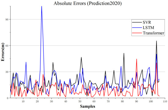 Figure 9 shows the deviation of the predicted coastline image for the first quarter of 2020 from the sample points of the exact coastline for the first quarter of 2020. The y-axis (m) denotes the absolute error, and the x-axis denotes the sample points. The coastline sample points are sampled at 200-m intervals, and the Euclidean distances from these sample points to the predicted coastline points are calculated. Figure 10 shows the distribution of coastline types in Weitou Bay in 2017 through Gaofen-2 images (the coastline types in the Weitou Bay area in 2020 were the same as those in 2017). In Figure 9, the coastline prediction results clearly reflect that the prediction results of the transformer model are better than those of the SVR model and LSTM model, and larger absolute errors are induced by the results obtained for the 24th sample and the 104th sample. The 24th sample point is located in a sandy coastline area, and the fluctuation of this coastline type is relatively stable. Because the image used in the experiment corresponds to 30 m per pixel, the errors of the prediction results yielded by the SVR and transformer methods can be equivalent to less than one pixel, and the error of the LSTM model is more than three pixels. Therefore, the LSTM method is insufficient for accurately predicting this area. The error value of the 104th sample point shows a sudden change when the coastline prediction results of the three prediction methods all exceed one pixel in this sample point. Specifically, we find that this sample point is located within the confines of a shipping company, which belongs to an artificial coastline area. In addition, Table 4 shows the RMSEs produced for the four coastline types obtained by the three prediction methods. The RMSE of artificial shorelines is larger than those of bedrock coastlines, sandy coastlines, and silt coastlines. In summary, artificial coastline areas are often subject to frequent human-made reconstructions and are greatly affected by human activities. Many anthropogenic interferences are predicted, and the results cannot be effectively obtained.