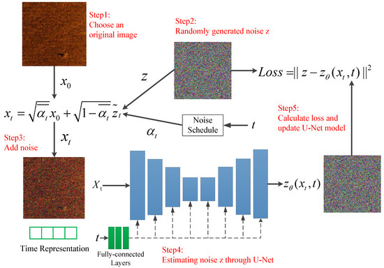 The distribution parameter, , in is the only remaining parameter yet to be determined. To approximate , we can utilize a U-Net-based neural network. In the forward process, the randomly generated serves as the ground truth label, and it is compared with the predicted to construct a loss function. By training the network, we can solve for . This process is depicted in Figure 2. The noise, z, cannot be directly calculated using a mathematical formula. Therefore, the noise, z, from the forward process is used as the label to train a neural network based on U-Net architecture, aiming to approximate the real noise.