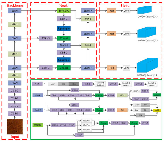 The network structure of YOLOv7 can be divided into four parts: input, backbone network, neck network, and head network, as shown in Figure 3. The input part preprocesses the images, including data augmentation and resizing to a unified size. The backbone network of yolov7 consists of three modules: MP1, CBS, and ELAN. The role of the backbone network is to extract high-level features from the original images using convolution and pooling operations. The neck network of YOLOv7 combines FPN and PAN structures, which include modules such as SPPCSPC, ELAN-H, MP2, and CBS. The neck network is the layer between the backbone network and the head network. Its purpose is to enhance feature extraction, fuse features from different layers of the backbone network, and adjust the channel number of feature maps to facilitate better integration with the head network. The head network of YOLOv7 controls the channel number using the Rep structure and employs detection heads representing large, medium, and small target sizes to handle objects of different scales. The role of the head network is to map the features extracted by the neck network to the final output, predicting the categories and locations of the targets.