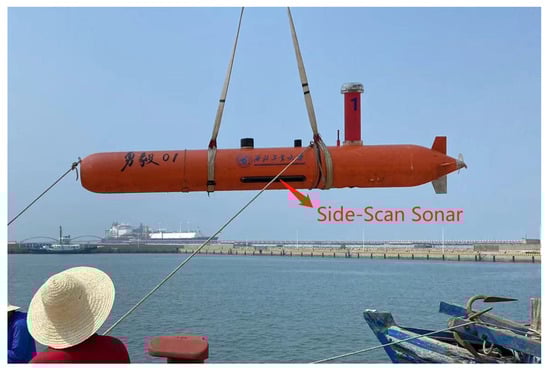 During the data collection phase, we utilized a 324-caliber AUV equipped with an SSS to navigate through designated areas where pre-placed targets were deployed, following a predetermined route. The AUV and the SSS utilized in the experiment are depicted in Figure 6.