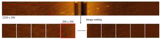 To achieve real-time processing of SSS images, we employ a strategy of extracting image segments from the sonar waterfall plot every 30 s, as shown in Figure 7. Additionally, the targets occupy a very small proportion of the entire SSS image. Directly inputting the entire image into the network for training would generate a large number of negative samples, which would impact the training process and waste computational resources. To address this issue, we crop the images into small patches of size 200 × 200 and each patch overlaps by 50 pixels to prevent loss of target features. From these patches, we select the ones that contain targets for training, thus avoiding irrelevant backgrounds that may introduce negative samples. Similarly, during the detection phase, we perform the same cropping operation before feeding the entire image into the detection network.