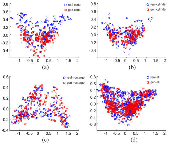 Relative texture dissimilarity of generated data and real data. (a) The generated cone and the real cone. (b) The generated cylinder and the real cylinder. (c) The generated non-target and the real non-target. (d) All generated data and all real data.
