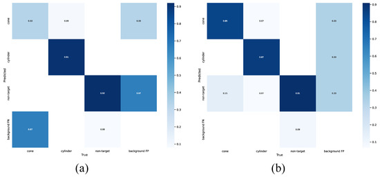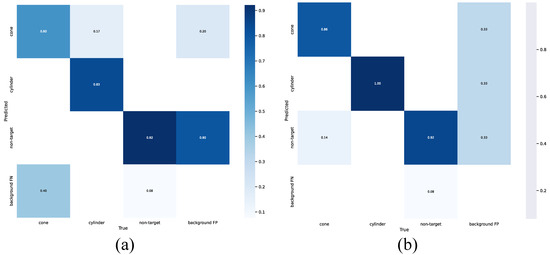 Comparison of confusion matrices for improved YOLOv7 networks trained on DatasetA and DatasetB on the test set. (a) Network trained using DatasetA. (b) Network trained using DatasetB.