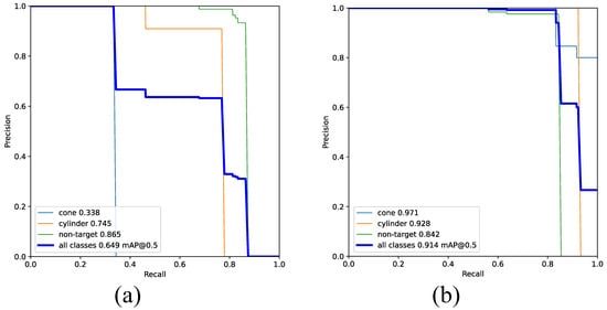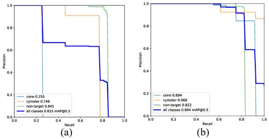 In order to further analyze model performance, we examined the PR curves, as presented in Figure 11. Notably, the network trained on DatasetB demonstrated a significantly higher mAP for detection when compared to the network trained on DatasetA. The mAP@0.5 value exhibited an impressive increase of 27.9%.