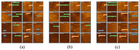 Comparison of detection results for improved YOLOv7 networks trained on DatasetA and DatasetB on the test set. (a) Ground truth labels. (b) Network trained using DatasetA. (c) Network trained using DatasetB.