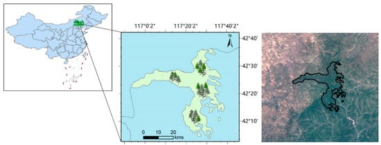 This study selected natural and planted forests located in Saihanba National Forest Park (116°32′~118°14′E, 41°35′~42°40′N) in the Hebei Province of China (Figure 2). The park is located in the temperate continental monsoon climate zone. The area of study site is 933.33 km2. The duration of winter is long, up to 230–240 days per year. The frost-free period is short. The temperature difference between day and night is large. The potential evapotranspiration is usually more than the annual precipitation. There are many types of climate hazards such as strong winds, sandstorms, droughts and frost. Based on the weather record from 1960 to 2015, the mean annual temperature is −1.5 °C, and the extreme daily low temperature is −43.3 °C. The mean annual precipitation is 452.6 mm. The altitude of the study area ranges from 1100 m to 1950 m. The average value is 1500 m. The altitude distribution of planted forests is higher than that of the natural forests. The dominant tree species in natural forests are Larix principis-rupprechtii, Picea asperata Mast and Betula platyphylla Suk. The planted forests are characterized by Pinus sylvestris var. mongolica and Larix principis-rupprechtii. The Saihanba region is a very important part of the Three-North Forest Shelterbelt Project in China. As of 2020, the forest area is 767.4 km2 and the forest coverage is 82%.