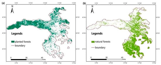 Spatial distribution of planted (a) and natural (b) forests in the Saihanba region of 2020.