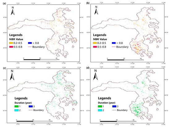 More than one-third of the area of planted (37.5%) or natural (35.8%) forests was highly disturbed. About 60% of forest disturbances were of lower intensity regardless of planted or natural forests (Figure 6a,b). High-intensity disturbances in natural forests occurred in the south of Saihanba, with a denser spatial distribution than that for planted forests in the north. The duration of forest disturbances was mostly 1 to 3 years in terms of planted or natural forests (Figure 6c,d).