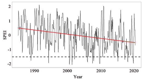 Time series of SPEI during the period from 1985 to 2020 in the Saihanba region.