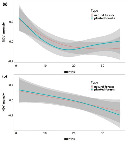 The NDVI anomaly of planted forests showed a faster decreasing rate than that of natural forests in the previous year and was half of that after drought disturbances (Figure 8a). Specifically, the NDVI anomaly of the planted forests changed from 0.24 to −0.08, while the variation changed from 0.22 to −0.06 for natural forests. After that period, the NDVI anomaly of planted forests presented a slow upward variation, while the NDVI anomaly of natural forests kept a relatively consistent level. In terms of heavy drought events, neither planted forests nor natural forests experienced recovery within three years after the disturbance of heavy drought (Figure 8b). Moreover, the decreasing rate of NDVI anomaly for planted forests was slightly higher than that of natural forests.