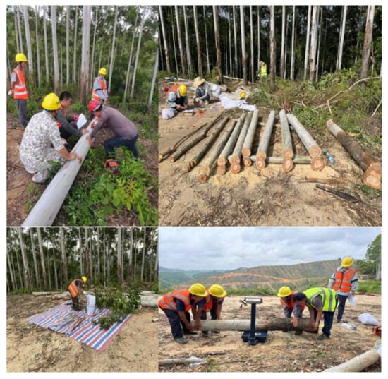 To verify the accuracy of our method, felling was conducted after scanning the sample trees (Figure 2). First, the DBH and height of the felled trees were measured using circumference ruler and tape measure. The DBH measurements ranged from 6.3 cm to 28.6 cm and the tree height measurements ranged from 11.10 m to 31.90 m. The branches of the felled trees were then weighed and resolved to determine the tree weights, tree volumes, wood densities, and carbon contents. To determine the wood density, the fresh volume of the tree core and branches was measured using the drainage method, and then the samples were dried in an oven at 65 °C for 72 h, while the dry volume was measured at regular intervals until a constant weight was optimal. To determine the carbon storage in the branch and trunk samples, the carbon content was determined using the potassium dichromate oxidation external heating method, which was repeated three times for each sample.