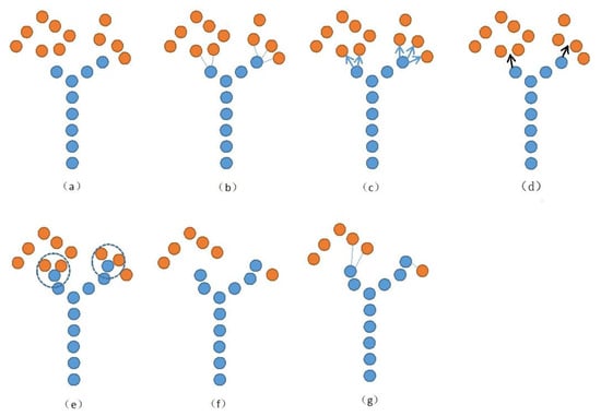 Runions proposed a spatial colonization algorithm with open vein sequences for leaf vein point extraction was used for 3D reconstruction []. The core idea comes from the competition for space during tree growth, which gradually generates skeleton points according to the point cloud distribution. One cycle of the iteration of the spatial colonization algorithm is shown in Figure 4. As shown in Figure 4a, the initial position of growth (i.e., the initial skeleton points) was first determined. Each point cloud in each iteration was associated with the skeleton point closest to it (Figure 4b), and each skeleton point finds the point clouds associated with it. These point clouds collectively influenced the growth of the next skeleton point by finding the normalized vectors from the skeleton point to these points (Figure 4c). The sum of these vectors was used as the growth direction of the next skeleton point (Figure 4d), and the distance of the next skeleton point is determined by the growth step. At the end of the growth phase, for newly grown skeleton nodes, the points within the radius of their deletion threshold were deleted (Figure 4e). The next loop, as shown in Figure 4f,g, was then performed until the specified number of iterations was reached or no more new skeleton points were generated.