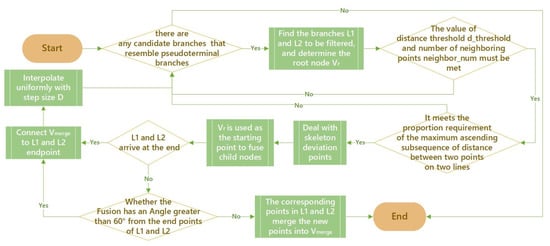 The obtained curve is extended along the direction of the root node, and, if an already existing skeleton point is searched within the distance threshold range , the independent branch is considered to be a new branch branch from the skeleton point. and are connected using a curve smoothing and interpolation algorithm.