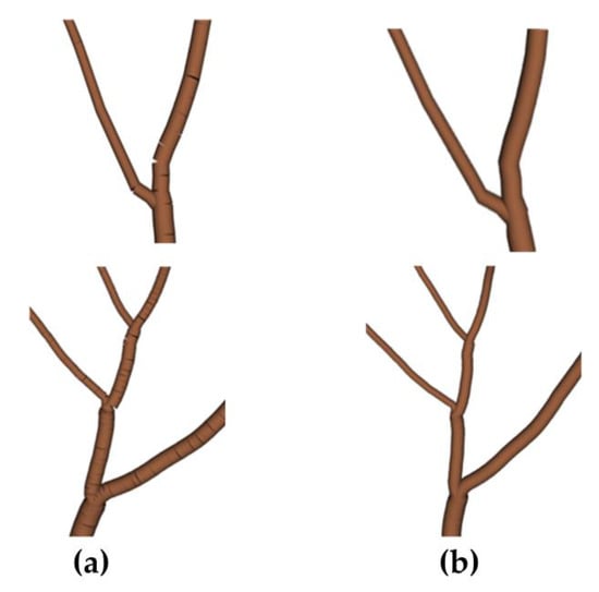 We use python language in PyCharm 2018.3.7 for development and open-source algorithm libraries and mathematical toolkits such as VTK8.1.2 and NetworkX 2.2 for modeling. This section shows the tree geometry and topology, including the location of branches, extension direction, and the relationship between parent and child branches. We use a directed graph to store the coordinates and topological relationships of the skeleton points generated by the algorithm, and a round table to represent each segment of branches. The directed graph stores information about each node (including positional coordinates, weights, radii, and other attributes), and each edge is regarded as the center axis of the circular table. The center positions of the two bottom surfaces of the circular table correspond to the coordinates of the two points constituting this edge, and the radius of the two bottom surfaces corresponds to the radii of the points in the middle of these two points. At this point, the skeleton line composed of points and lines expands into a 3D model. Directly connecting multiple circular platforms results in a break at the connection, where a segment of connected points can be connected to form a non-breaking pipe. Since there are bifurcation points in the directed graph and only parent and child relationships between nodes are stored, there is no information about all sequentially connected points that can be used to generate a pipe, the algorithm is designed to extract the set of all sequentially connected points in the directed graph. When the search does not encounter a bifurcation point, the traversed points can be directly added to the array; when a bifurcation point P is encountered, the array is saved, and the search is repeated with P as the starting point. The effect before and after processing is shown in Figure 8.
