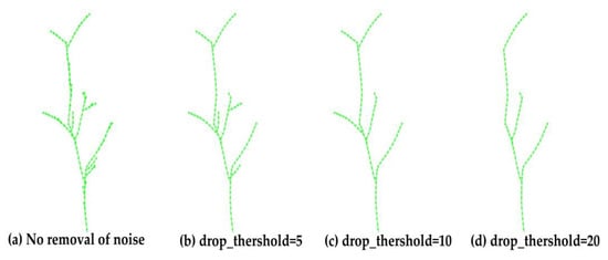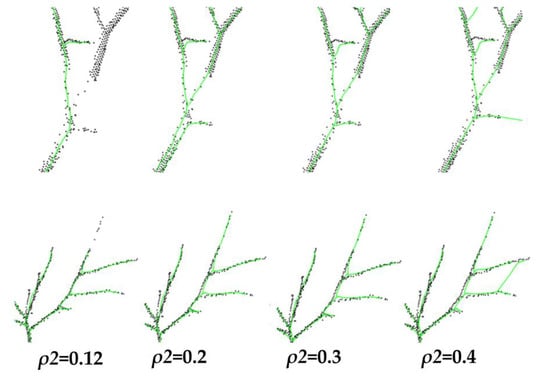 The effectiveness of the spatial colonization algorithm depends on important parameters such as the growth step , the deletion threshold and the influence radius . The parameters can be adjusted appropriately if one expects to obtain skeleton points that accurately reflect the topology and direction of the tree’s branches and trunks. indicates the range of the field of view during the growth process, and when becomes smaller, the growth direction reflects the direction of the point clouds at the point closer to the current skeleton point. If the skeleton point slightly deviates from the main stem or the point clouds at that place are not uniformly distributed, it is easy to cause the problem of unstable growth direction. It is also possible that the point clouds in a certain part are sparse and the spacing is larger than the smaller influence radius leading to an early end of growth on that branch, which greatly increases the demand on the quality of the point clouds. When becomes large, the growth of the skeleton will prematurely encounter the bifurcation point of the branch, creating the problem of early bifurcation, which does not accurately reflect the structure of the skeleton.