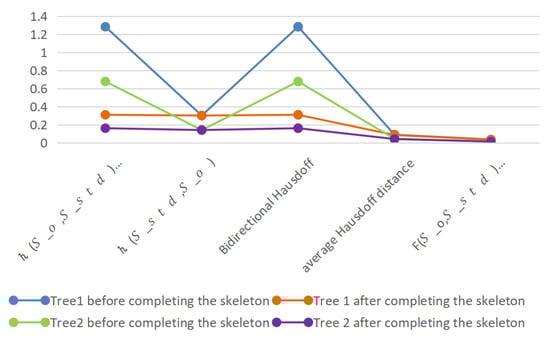 - Treatment of skeleton deviation points and fusion of near-parallel branches: The fused branch is jointly influenced by two near-parallel branches. If a part of one branch deviates too much and is not within the d_threshold neighborhood of the other branch, i.e., there exists and Equation (9) is satisfied for any point ,then the point is deleted so as not to affect the deviation of the skeleton after fusion. Assuming that the skeleton points that are consecutively deleted in a segment arethen and are connected and interpolated uniformly with a step size D. Finally, the weighted average points of the corresponding points of L1 and L2 are taken and fused sequentially from the root to the tip. During the fusion process, to avoid the unreasonable visual effect of excessive fusion resulting in too large an angle, the angle between the newly generated points and the points outside the L1 and L2 lines is judged until the last point that makes the angle less than or equal to 60 degrees, thus ensuring a reasonable trend in the growth of tree branches.