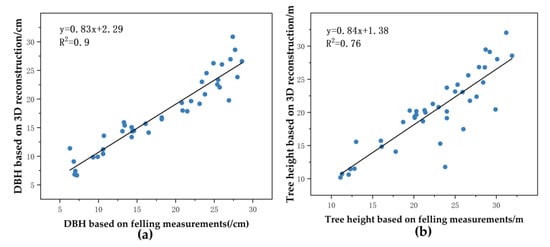 The accuracy of point cloud-based reconstruction of eucalyptus trees for DBH and tree height is shown in Table 6. The Bias and RMSE of the breast diameter calculated by least squares were −0.56 cm and 2.38 cm, respectively. Among the 41 trees with DBH reference values ranging from 6.3 cm to 28.6 cm, the absolute value of DBH deviation less than 2.38 cm accounted for 70.7% of the total trees. The bias and RMSE of tree height were −2.24 m and 3.68 m, respectively. Among all the trees whose reference height ranges from 11.10 m to 31.90 m, 75.6% of the trees with absolute deviation of tree height was less than 3.68 m.