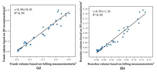 Comparison of trunk and branch volume based on 3D reconstruction of trees with reference values: (a) trunk volume; (b) branch volume.