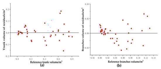 Figure 23 shows the residual distributions for the reconstructed trunk and branch volumes. Most of the trunk volume residuals were more evenly distributed on both sides of the y = 0 line and most of the residuals were between −0.1 m3 and 0.1 m3, with no significant difference in the range of residual distributions as the volume of the reference tree increases. Figure 23b provides the distribution of the residuals for the volume of the reconstructed tree branches. Most of the volume residuals were more evenly distributed on both sides of the y = 0 line, and most of the residuals were between −0.02 m3 and 0.02 m3. The range of residual distributions was not significantly different with increasing reference tree volume.