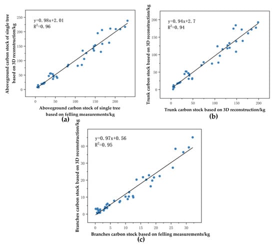 Therefore, the carbon stock estimated by destructive measurements was estimated with minimal assumptions and was therefore used as a reference for comparing the performance of other methods [,]. Statistical results showed high agreement between the reconstructed carbon stock estimates and destructive measurements, with an R2 of 0.96 for the linear fit between the point cloud reconstructed single-tree aboveground carbon stock estimates and the reference values, an RMSE of 14.94391 kg, and a CV(RMSE) of 16.23%. The R2 of the linear fit of the trunk carbon stock estimate and the reference value was 0.94, the RMSE was 15.03535 kg, and the CV(RMSE) was 18.35%. The R2 of the linear fit of the branch carbon stock estimate to the reference value was 0.95, the RMSE was 3.90454 kg, and the CV(RMSE) was 38.39%. The biggest difference between this method and allometric equation is that it does not depend on DBH or tree height. We experimentally showed that the reconstruction results did not systematically overestimate or underestimate breast diameter, tree height, tree volume, and aboveground carbon stocks for tree size and shape.