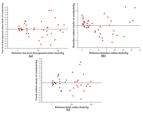 Figure 25 shows the distribution of residuals for the reconstructed carbon stocks for single trees, trunks, and branches, respectively. Most of the single-tree aboveground carbon stock residuals were more evenly distributed on either side of the y = 0 line, and most of the residuals were between −20 kg and 20 kg, with the range of residual distributions not differing significantly with increasing carbon stock in the reference trees. Figure 25b provides the distribution of carbon stock residuals for reconstructed tree branches. Most of the carbon stock residuals were more evenly distributed on both sides of the y = 0 line, and most of the residuals were between −5 kg and 5 kg, with no significant difference in the range of residual distributions as the reference tree carbon stock increases. Figure 25c provides the distribution of carbon stock residuals for the reconstructed tree trunks. Most of the carbon stock residuals were more evenly distributed on both sides of the y = 0 line and most of the residuals were between −20 kg and 20 kg, with no significant difference in the range of residual distributions as the reference tree carbon stock increases.