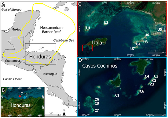 The Mesoamerican Barrier Reef (MBR) is the second largest barrier reef system in the world, extending 1000 km from the Yucatan Peninsula to the Honduran Bay Islands in the western Caribbean Sea. Ecosystem services provided by the MBR, primarily from tourism and fishing, directly support several million people along the MBR coastlines [42]. Utila and Cayos Cochinos (Figure 1) are located at the southern end of the MBR and sit atop a 75 km wide continental shelf that runs along the Honduran Caribbean coastline. The region has been considerably less studied than the northern MBR in Belize and Mexico [34,35,38,39,43]. Utila is the smallest of the three Bay Islands that are the central focus of Honduran reef-related tourism and fishing industries. Twelve reef islands (locally termed sand cays) are located off Utila’s western coastline. Cayos Cochinos is a Marine Protected Area located approximately 48 km southeast of Utila. The archipelago spans 460 km2 and is managed by the Honduran Coral Reef Fundación. It comprises 2 larger islands and, currently, 13 smaller reef islands. The majority of Utila and Cayos Cochinos cays are privately owned and uninhabited for most of the year. Exceptions are Suc-Suc and Pigeon Cays in Utila (home to ~500 inhabitants, and Cayo Chachauate in Cayos Cochinos (home to 200 people from the Garifuna community).