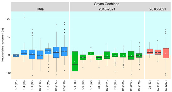 Box (50% quartile) and whisker (95% quartile) plots representing net shoreline movement (NSM, m) transect data for the respective maximum study periods of Utila and Cayos Cochinos reef islands (Table 1). White squares represent mean NSM (m) for each island. Reference line at 0 m NSM represents island stability and, either side, positive values represent island accretion, and negative values represent island erosion. Numbers in brackets equal transect sample size. Islands are ordered by ascending size.