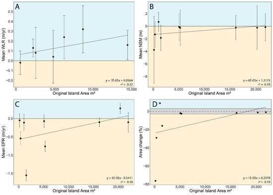 Original area of reef islands in Utila (A) and Cayos Cochinos (B–D) compared against (A) mean island weighted linear regression (WLR) in Utila (m/yr); error bars represent uncertainty of the average WLR using reduced n [69]. In Cayos Cochinos, reef island area was compared against (B) mean island net shoreline movement (NSM, m; error represented by standard deviation), (C) mean end-point ratio (EPR, m/yr; error represented by summation of squares calculated by DSAS), and (D) proportional area change between 2018 and 2021 (%), where grey shading represents a ±3% threshold of island stability). Black lines represent regression (y = mx + c) between respective variables; dashed lines represent complete island stability (0), either side of which represents either island erosion or accretion.