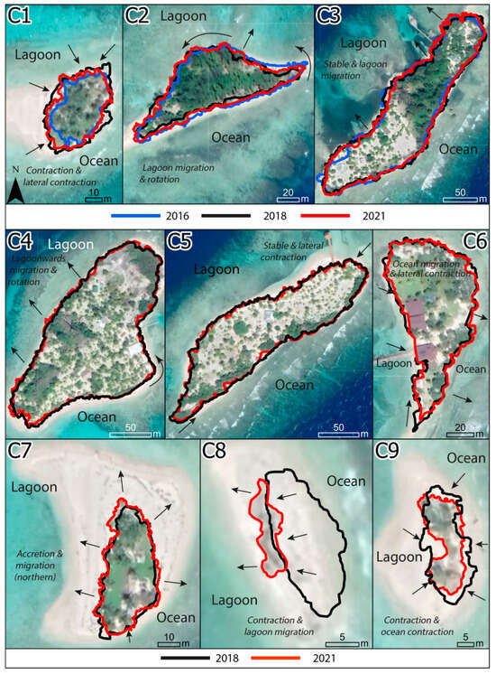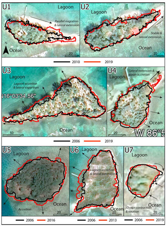 Island migration (referring to a shift in the overall position of the reef island on the reef platform, Table 6) was the second most common mode of shoreline change, identified on six of the sixteen islands. Five of these islands were in Cayos Cochinos, making it the most common mode at this site, considering primary and secondary modes of change. The direction of migration was predominately lagoonwards (e.g., C2, Figure 4), but also occurred oceanwards (U6, Figure 4), parallel along the reef platform (U1, Figure 4), and in a northerly direction (C7, Figure 4).